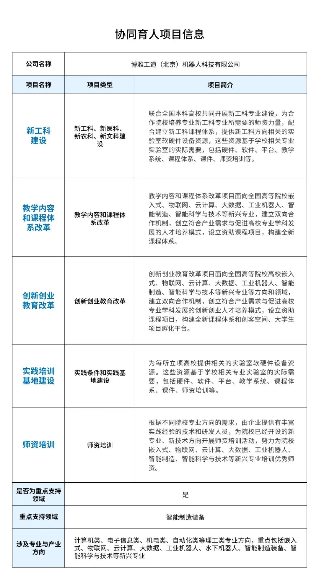 博雅工道(北京)機(jī)器人科技有限公司2023年第二批產(chǎn)學(xué)合作協(xié)同育人項(xiàng)目正式啟動(dòng),歡迎各高校可根據(jù)情況和產(chǎn)學(xué)合作需要,組織師生在平臺(tái)注冊(cè)申報(bào)。