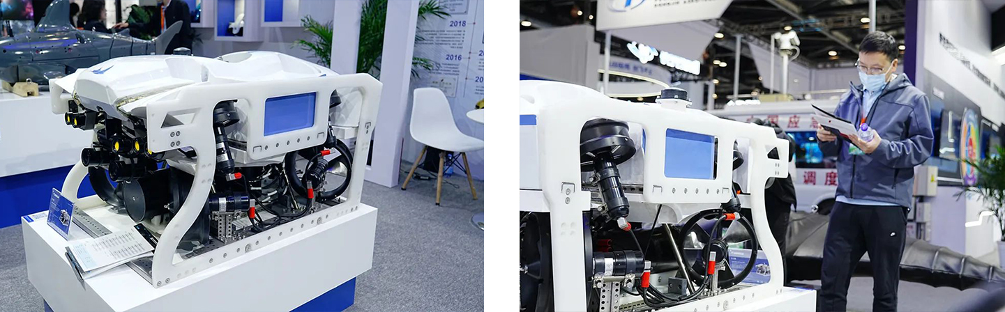 博覽會(huì)現(xiàn)場(chǎng),輕型作業(yè)級(jí)水下機(jī)器人 R-150 初次公開。R-150 具有高性能、強(qiáng)海況適應(yīng)性等特點(diǎn),采用高強(qiáng)度框架材料和大功率推進(jìn)系統(tǒng),拓展能力強(qiáng),可以滿足一定強(qiáng)度的海工作業(yè)需求。其優(yōu)越的性能指標(biāo)媲美國(guó)外同量級(jí)競(jìng)品,實(shí)現(xiàn)國(guó)產(chǎn)化替代。