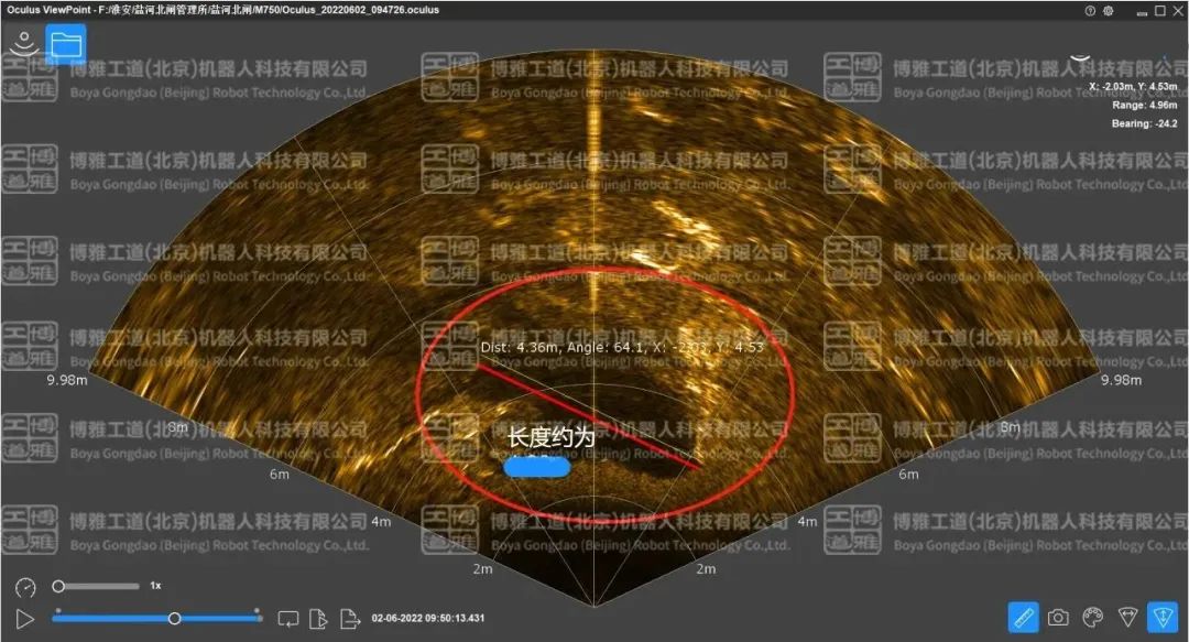 除了搭載光學(xué)鏡頭以采集的視頻圖像信息,水下機(jī)器人還可以同時(shí)攜帶多種聲吶,以滿足不同種類的檢測(cè)需求,例如多波束聲吶和管道聲吶,聲吶圖像一方面利于水下機(jī)器人在黑暗中行進(jìn),一方面能能更真實(shí)地反映水工建筑物的水下?tīng)顩r。水下作業(yè)完成后,工程技術(shù)服務(wù)團(tuán)隊(duì)根據(jù)聲吶圖像計(jì)算出準(zhǔn)確的數(shù)據(jù),出具檢測(cè)報(bào)告,對(duì)于淤積和裂痕的測(cè)量有著至關(guān)重要的作用。