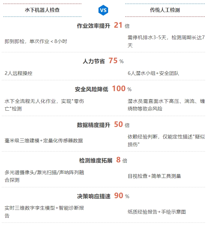 - 無需停機(jī)排水:R-45(ROV)支持水下自主作業(yè),電站正常運營不受影響。